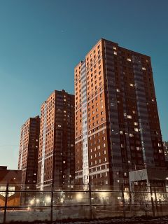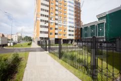 Монолитно-кирпичный жилой комплекс комфорт-класса "Поэт" 2022 г. постройки с закрытой территорией, вишневым садом, детскими площадками и местами для отдыха.