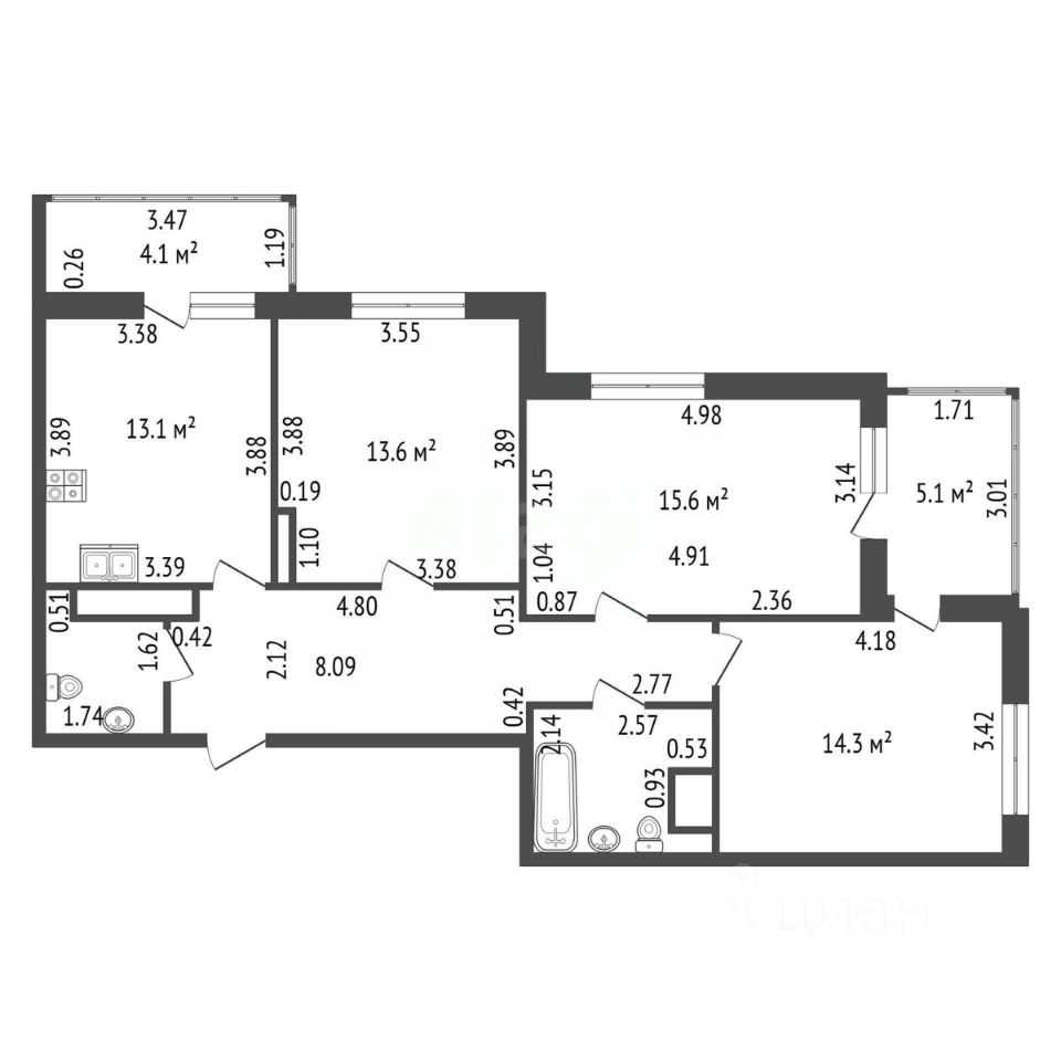 Видовая, просторная, светлая квартира в современном ЖК Жемчужный каскад в районе с неплотной застройкой. Окна выходят на север на Финский залив и на восток. Большая кухня - 13,1 м2, два застекленных балкона 4,1 м2 и 5.1 м2, два санузла. В доме нет студий.