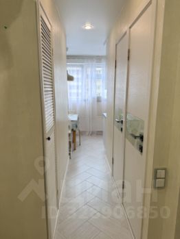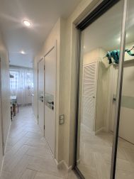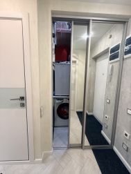 В коридоре расположен встроенный шкаф, где помещается просторная гардеробная, стиральная машина и морозильная камера.