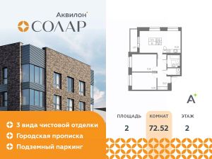 Просторная 2-комн. квартира с предчистовой отделкой в ЖК "Аквилон Солар" на 2 этаже. Общая площадь: 72.52 кв.м., жилая: 25.16 кв.м., площадь просторной кухни-столовой: 26.58 кв.м. Квартира угловая, очень светлая, естественная вентиляция при открытии окон. В квартире одна лоджия, один совмещенный санузел. Высота потолков 2.7 м.