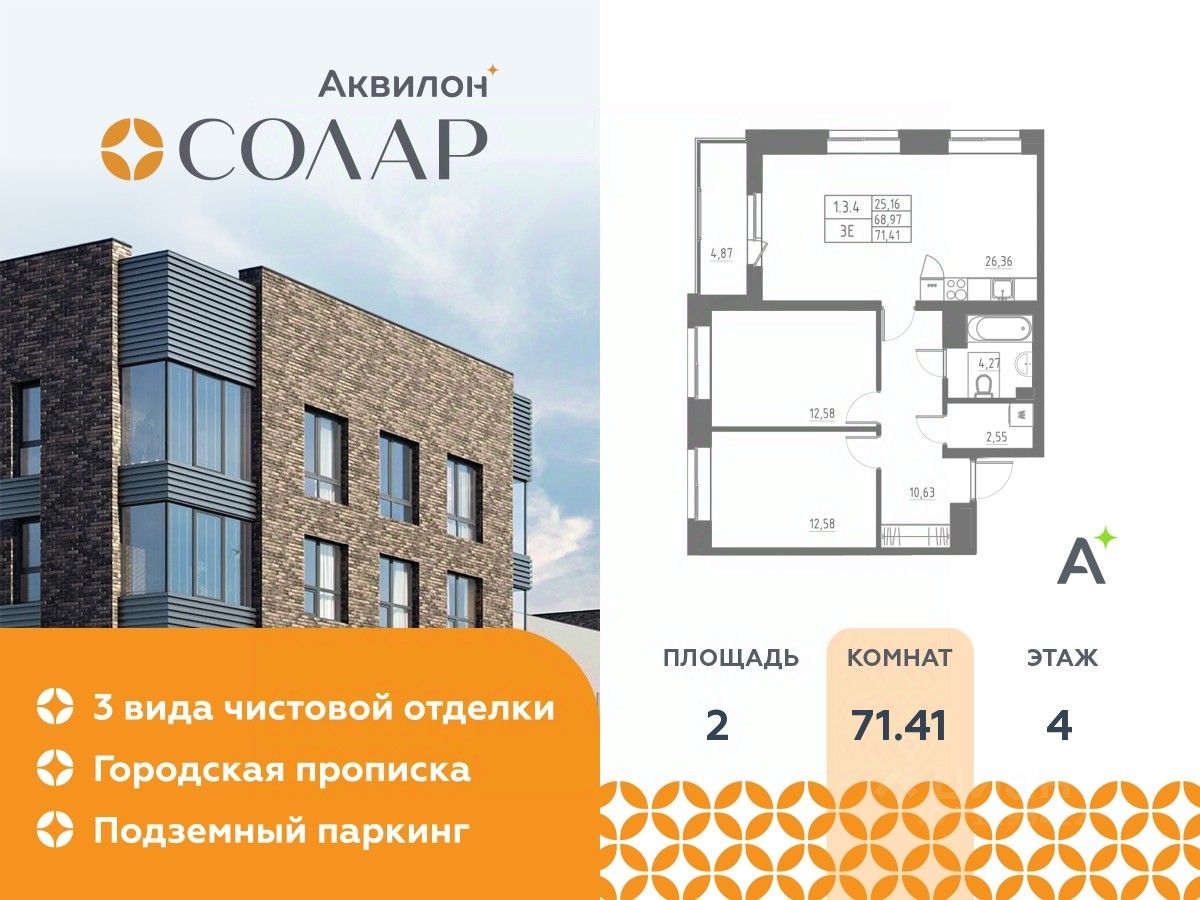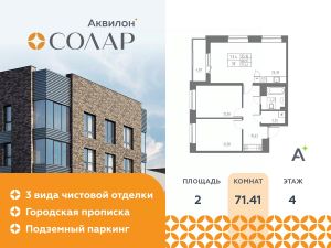 Двухкомнатная квартира с предчистовой отделкой в ЖК "Аквилон Солар" на 4 этаже. Общая площадь: 71.41 кв.м., жилая: 25.16 кв.м., площадь просторной кухни-столовой: 26.36 кв.м. Угловая квартира, идеально подойдет любителям тишины и панорамных видов. В квартире одна лоджия, один раздельный санузел. Высота потолков 2.7 м.
