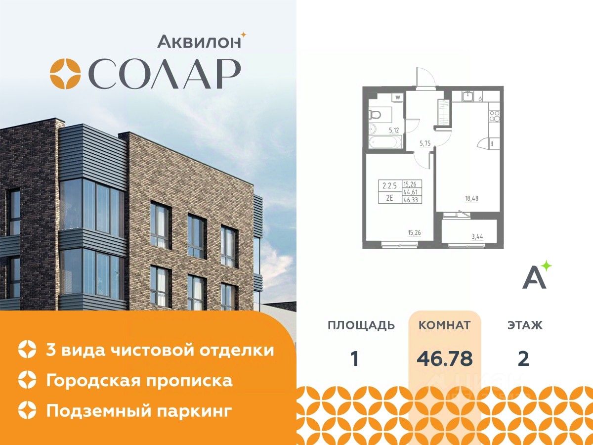 Однокомнатная квартира от застройщика с предчистовой отделкой в ЖК "Аквилон Солар" на 2 этаже. Общая площадь: 46.78 кв.м., жилая: 15.26 кв.м., площадь просторной кухни-столовой: 18.67 кв.м. Все окна выходят на одну сторону. В квартире одна лоджия, один совмещенный санузел. Высота потолков 2.7 м.