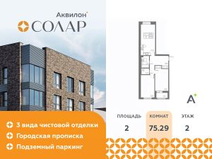 Двухкомнатная квартира от застройщика с предчистовой отделкой в ЖК "Аквилон Солар" на 2 этаже. Общая площадь: 75.29 кв.м., жилая: 31.36 кв.м., площадь просторной кухни-столовой: 22.52 кв.м. Квартира - распашонка, без проходных комнат, окна выходят на paзные стороны дома. В квартире одна лоджия, один раздельный санузел. Высота потолков 2.7 м.