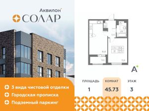 Однокомнатная квартира от застройщика с предчистовой отделкой в ЖК "Аквилон Солар" на 3 этаже. Общая площадь: 45.73 кв.м., жилая: 15.26 кв.м., площадь просторной кухни-столовой: 18.48 кв.м. Все окна выходят на одну сторону. В квартире одна лоджия, один совмещенный санузел. Высота потолков 2.7 м.