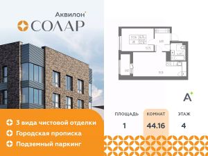 Просторная 1-комн. квартира с предчистовой отделкой в ЖК "Аквилон Солар" на 4 этаже. Общая площадь: 44.16 кв.м., жилая: 12.75 кв.м., площадь просторной кухни-столовой: 19.15 кв.м. Все окна выходят на одну сторону. В квартире одна лоджия, один совмещенный санузел. Высота потолков 2.7 м.