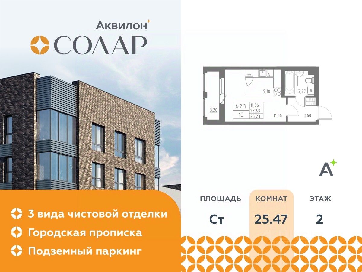 1-комн. квартира-студия от застройщика с предчистовой отделкой в ЖК "Аквилон Солар" на 2 этаже. Общая площадь: 25.47 кв.м., площадь гостиной 16.21 кв.м., из которых 5.15 кв.м. выделено под кухонную зону. Все окна выходят на одну сторону. В квартире один балкон, один совмещенный санузел. Высота потолков 2.7 м.