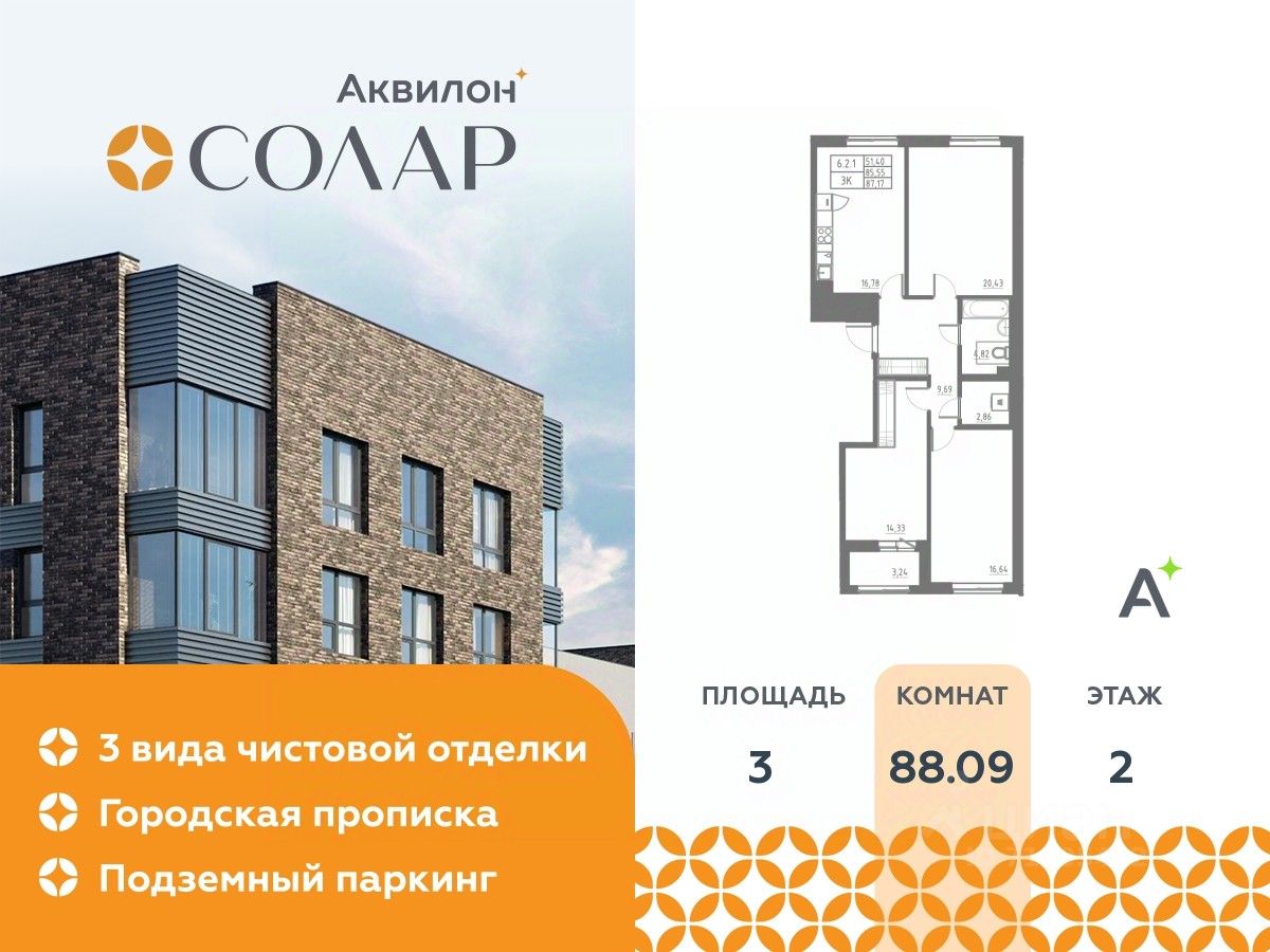 3-комн. квартира от застройщика с предчистовой отделкой в ЖК "Аквилон Солар" на 2 этаже. Общая площадь: 88.09 кв.м., жилая: 51.4 кв.м., площадь просторной кухни-столовой: 16.95 кв.м. Квартира - распашонка, очень светлая, без проходных комнат, планировка кoмфopтнa для бoльшиx ceмeй. В квартире одна лоджия, один совмещенный санузел. Высота потолков 2.7 м.