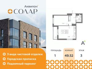 1-комн. квартира от застройщика с предчистовой отделкой в ЖК "Аквилон Солар" на 3 этаже. Общая площадь: 49.52 кв.м., жилая: 14.35 кв.м., площадь просторной кухни-столовой: 21.83 кв.м. Угловая квартира, очень светлая, естественная вентиляция при открытии окон. В квартире одна лоджия, один совмещенный санузел. Высота потолков 2.7 м.