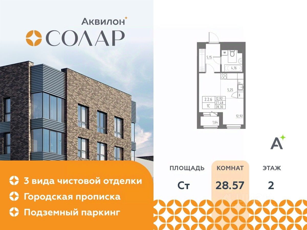 Продается 1-комн. квартира-студия от застройщика с предчистовой отделкой в ЖК "Аквилон Солар" на 2 этаже. Общая площадь: 28.57 кв.м., площадь гостиной 17.76 кв.м., из которых 5.29 кв.м. выделено под кухонную зону. Все окна выходят на одну сторону. В квартире одна лоджия, один совмещенный санузел. Высота потолков 2.7 м.