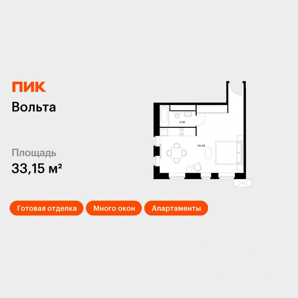 Продаются апартаменты-студия площадью 33,15 кв.м на 11 этаже 15 этажного дома (Вольта, Секция 1) проекта ПИК Вольта.