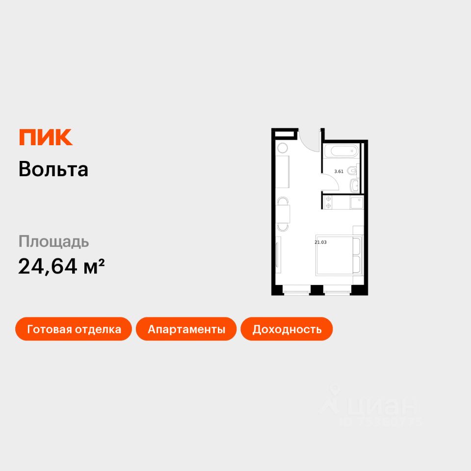 Продаются апартаменты-студия площадью 24,64 кв.м на 13 этаже 15 этажного дома (Вольта, Секция 1) проекта ПИК Вольта.