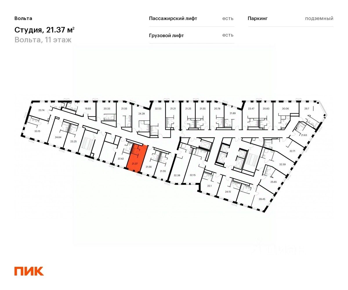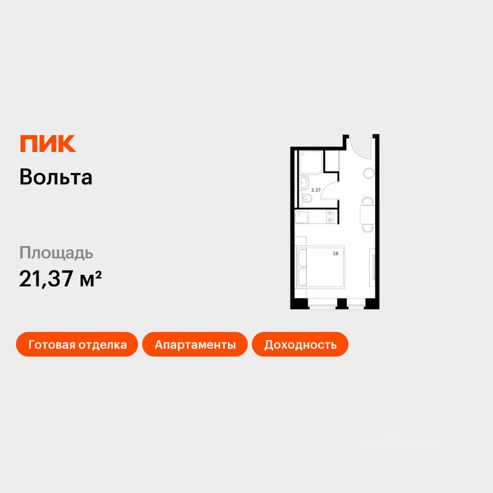Продаются апартаменты-студия площадью 21,37 кв.м на 11 этаже 15 этажного дома (Вольта, Секция 1) проекта ПИК Вольта.