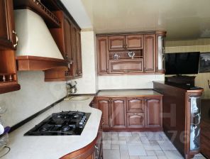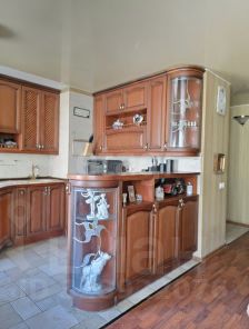 - деревянная кухня в классическом стиле с вытяжкой, варочной поверхностью, холодильником; большой обеденный стол и стулья, диван.