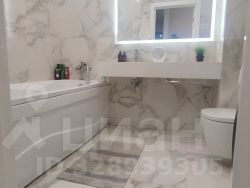 Ванная комната выполнена в светлых тонах с мраморной отделкой и современной сантехникой. Сенсорное зеркало с дополнительным освещением. Навесной унитаз. Ванна с гидромассажем и подсветкой. Теплый пол. Новая стиральная машина.