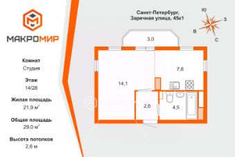 Планировка удобная: основное пространство 21,9 м², которое легко зонировать на кухню, зону отдыха и спальное место.