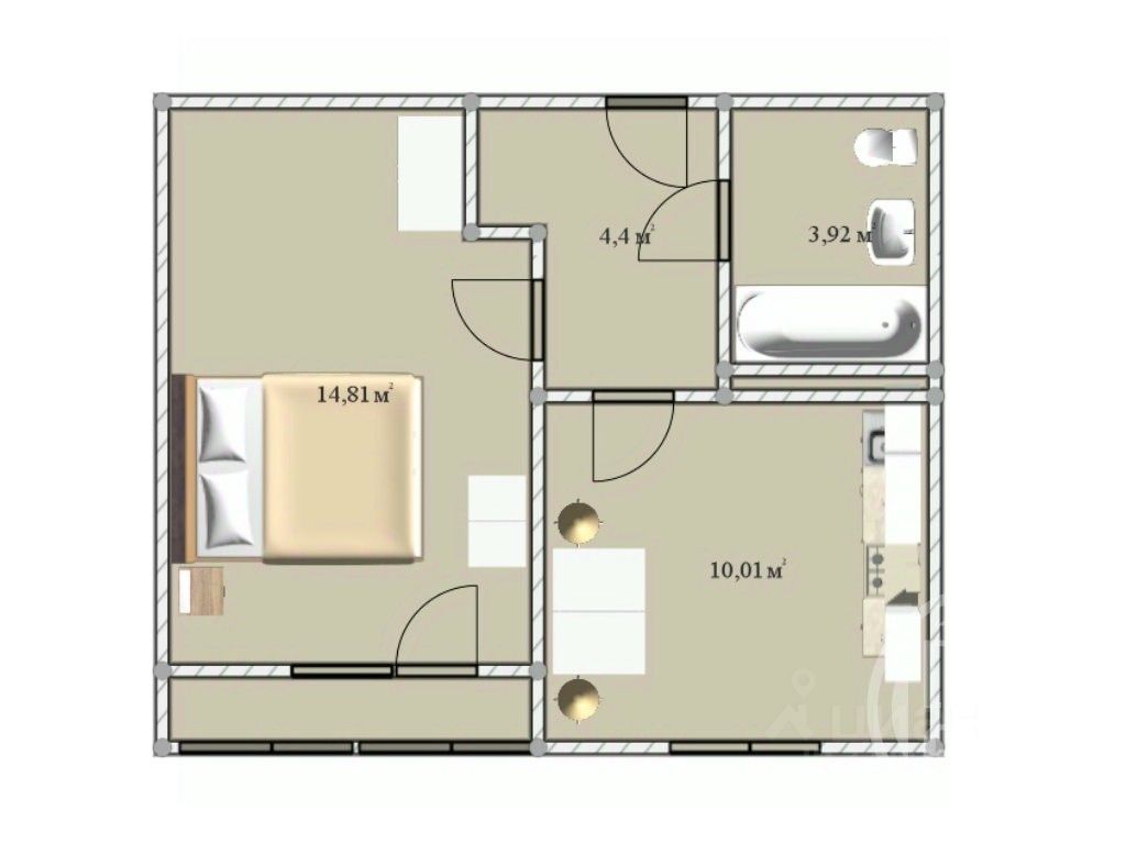 Планировка предполагает просторную комнату с выходом на застекленную лоджию, совмещенный санузел, кухню с эргономичным гарнитуром, нишу в прихожей под гардероб.