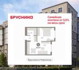 1-комн. квартира с предчистовой отделкой в ЖК "Брусника в Новоселье" на 3 этаже. Общая площадь: 40.49 кв.м., жилая: 13.8 кв.м., площадь просторной кухни-столовой: 18.5 кв.м. Все окна выходят на одну сторону. В квартире один совмещенный санузел. Высота потолков 2.7 м.