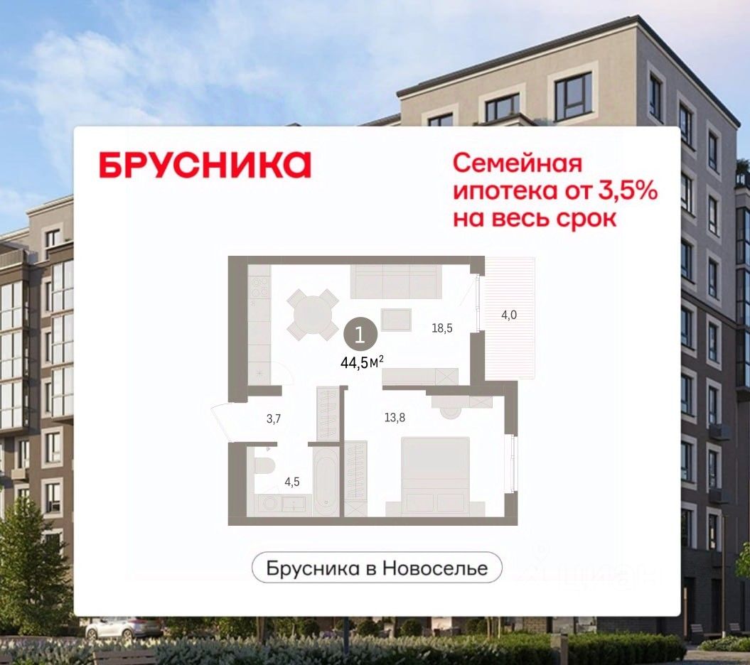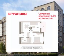 1-комн. квартира с предчистовой отделкой в ЖК "Брусника в Новоселье" на 6 этаже. Общая площадь: 44.47 кв.м., жилая: 13.8 кв.м., площадь просторной кухни-столовой: 18.5 кв.м. Все окна выходят на одну сторону. В квартире одна лоджия, один совмещенный санузел. Высота потолков 2.7 м.