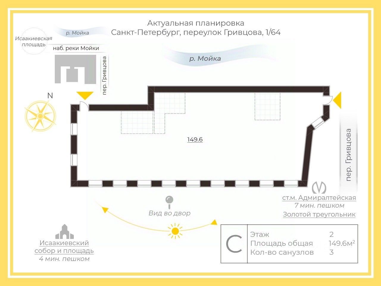 -Предусмотрено два входа: парадный с улицы Мойки и черный со двора с выходов в переулок Гривцова.