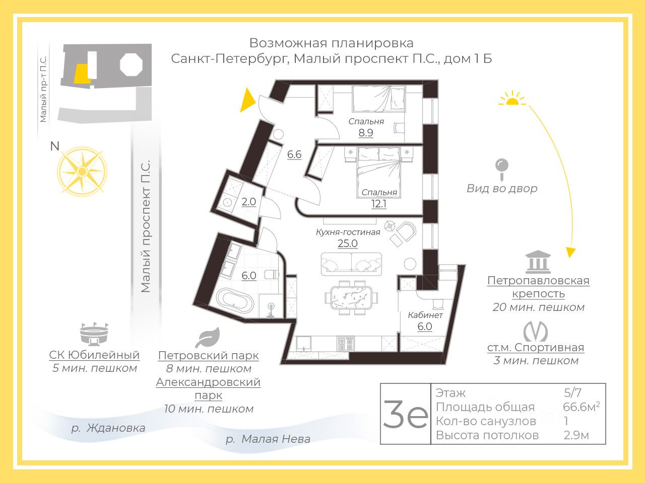До метро "Спортивная" — 3 минуты пешком, удобные выезды во все стороны города, развитая инфраструктура. В пешей доступности находится все необходимое - магазины, кафе, пункты выдачи заказов, прогулочные зоны, парки, государственные образовательные и медицинские учреждения!