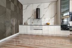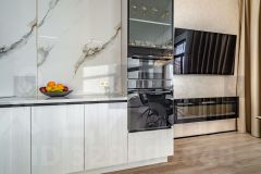 Система хранения продумана до мелочей: предусмотрены выдвижные ящики, шкафы с доводчиками, специальные зоны для хранения специй и кухонной утвари. Многоуровневое освещение создает уютную атмосферу.