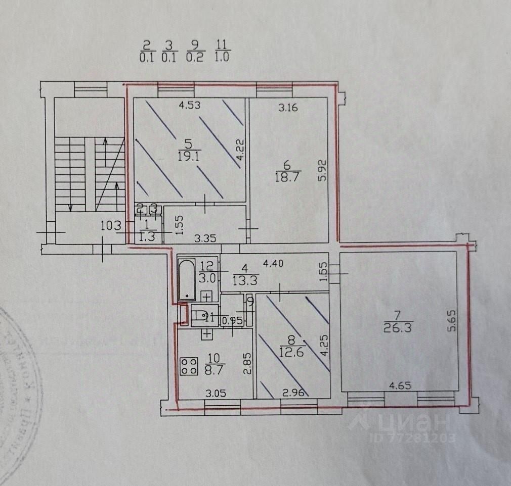 Жилая площадь составляет 76,7 кв. м, а кухня — 8,7 кв. м. Квартира расположена на втором этаже пятиэтажного кирпичного дома, построенного в 1951 году. Высокие потолки — 2,9 метра Дом находится в хорошем состоянии, с наземной парковкой для жителей, что обеспечивает удобство в использовании автомобиля. Местоположение дома делает его идеальным для семейного проживания: в округе есть школы, детские сады, клиники и магазины.