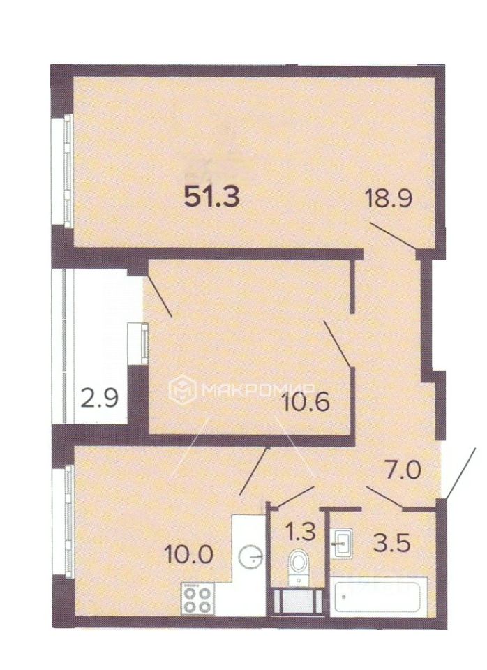 Расположена на 11 этаже, общая площадь 51,3 м², высота потолков 2,75 м.;