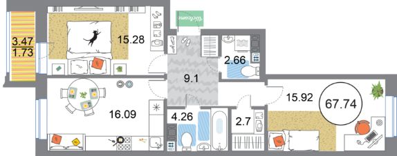 Продаётся 3-комнатная квартира в сданном доме (Дом 54 (Корпус 3)), срок сдачи: I-кв. 2023, общей площадью 67.74 кв.м., на 6 этаже. О квартале