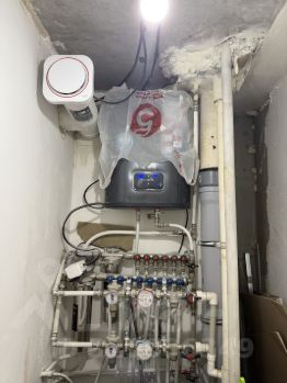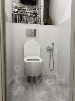 В туалете плитка до середины стены. Подвесной унитаз, гигиенический душ. Есть вывод для установки раковины. Установлен водонагреватель, фильтры для очистки воды и компенсатор давления.