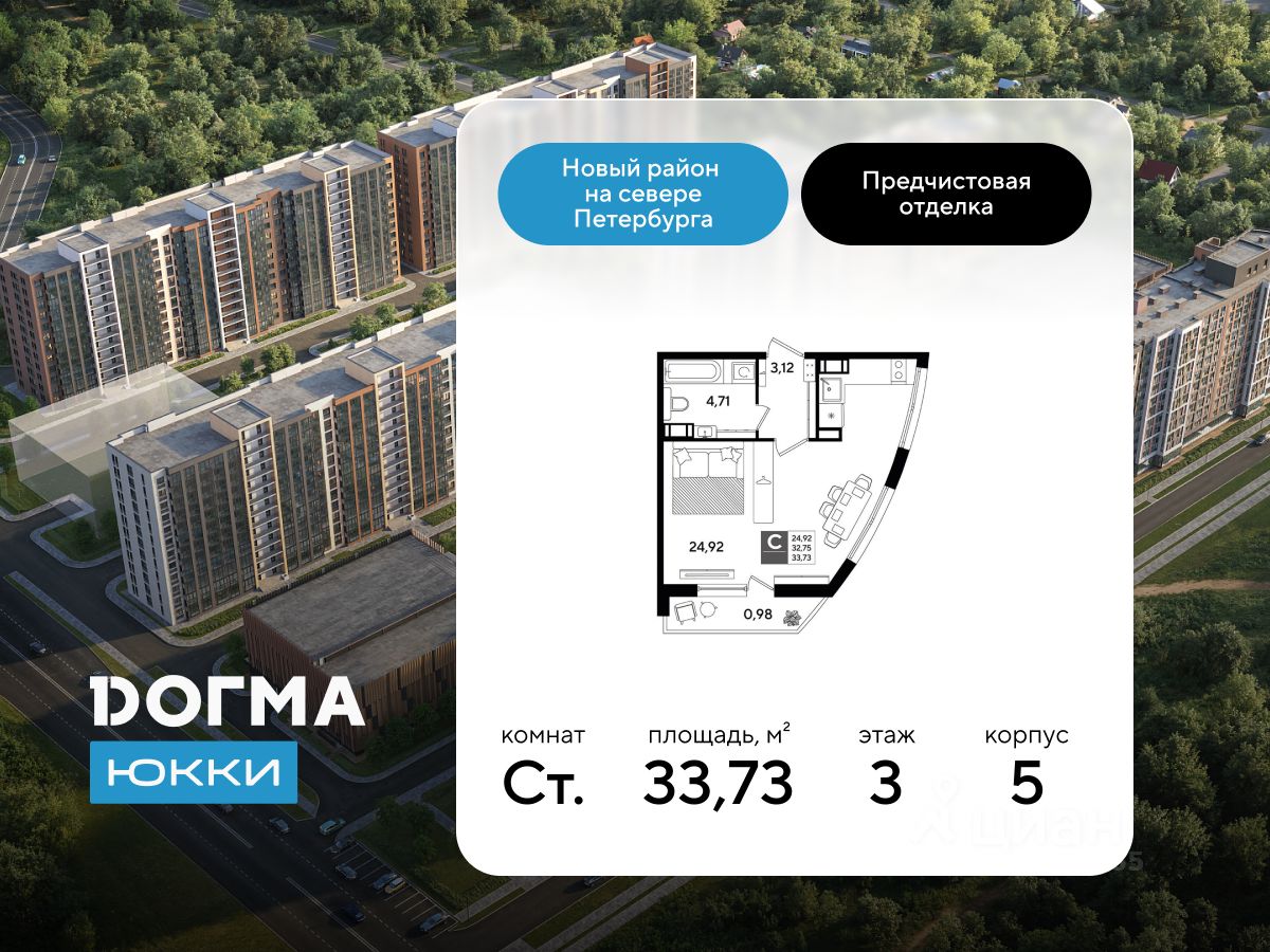 В продаже студия от застройщика ЖК "Догма Юкки" в Ленинградской области.