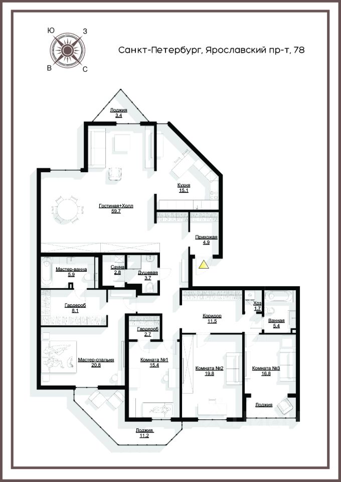Квартира включает: большую кухню-гостиную 75 м², мастер-спальню с собственной гардеробной, санузлом и лоджией, ещё три спальни, одна из которых также с гардеробом. Всего три санузла, полноценная сауна, два панорамных балкона. Высота потолков — 2,77 м. Пространство наполнено светом, воздухом и ощущением спокойствия.