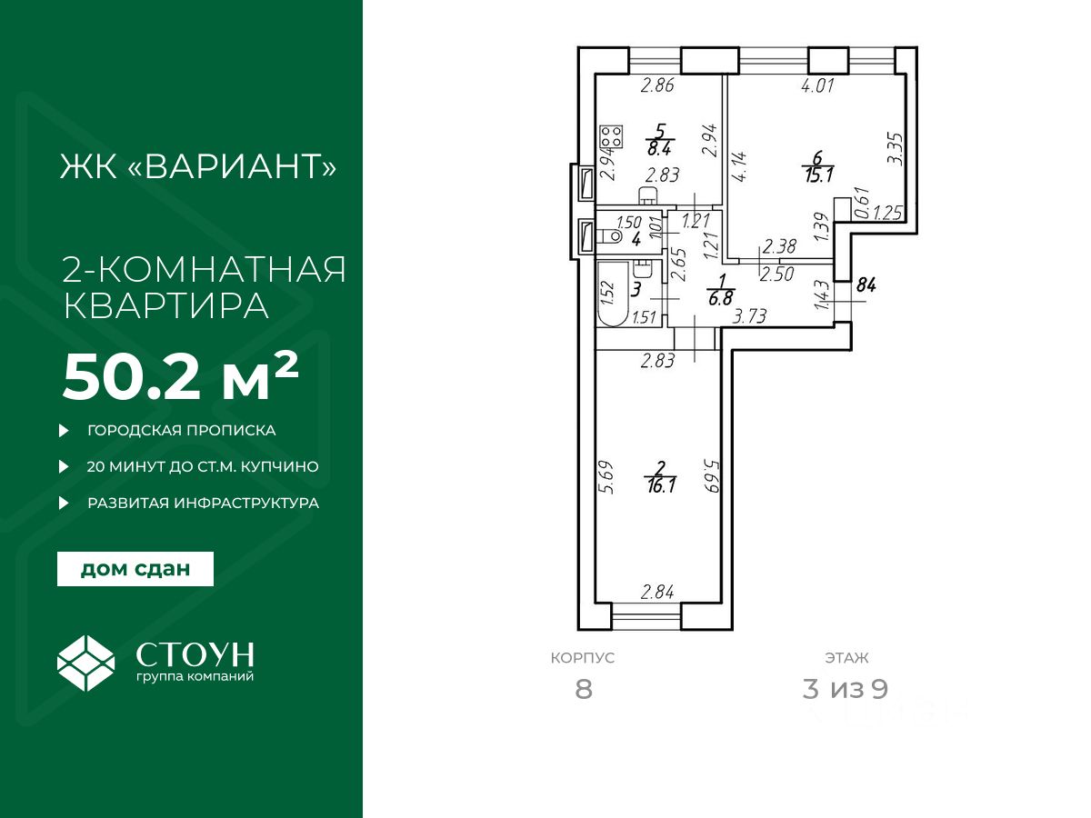 Продаётся 2-комнатная квартира в сданном доме (Московское, 256к1 (Корпус 8)), срок сдачи: III-кв. 2021, общей площадью 50.2 кв.м., на 3 этаже. На земельном участке в Шушарах (м/р Ленсоветовский), общей площадью 27155 кв.м. будет построено 8 кирпичных жилых домов: Высотность - девять этажей 1-5 этажи - без балкона 6-9 этажи - с балконами.