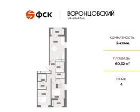 Цена со скидкой до 30% в прямой продаже от застройщика — только в этом месяце. Беспроцентная рассрочка. 2-к квартира в ЖК Квартал "Воронцовский" на 4-м этаже. Общая площадь 60,32. Чистовая отделка.