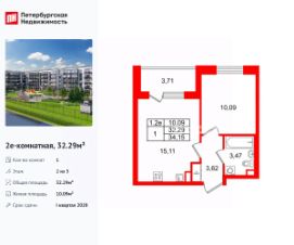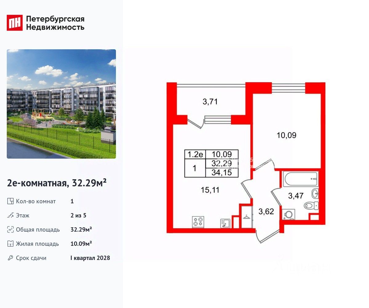 Удобная, классическая, функциональная европланировка, большая кухня-гостиная 15.11 м², вместительная прихожая 3.62 м². Общая площадь квартиры - 32.29 м², жилая 10.09 м², высота потолка 2.77 м.