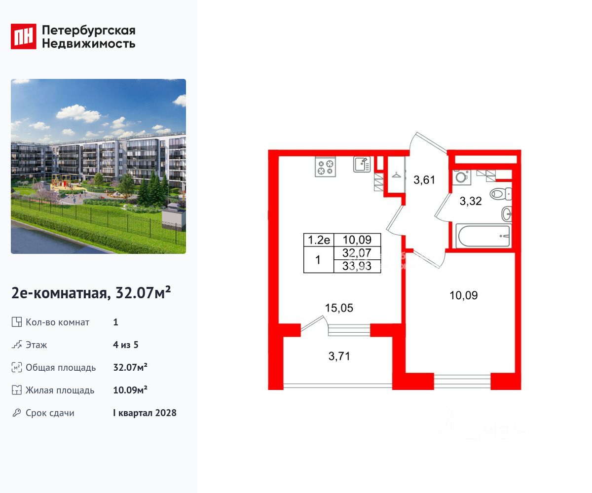 Удобная, классическая, функциональная европланировка, большая кухня-гостиная 15.05 м², вместительная прихожая 3.61 м². Общая площадь квартиры - 32.07 м², жилая 10.09 м², высота потолка 2.77 м.