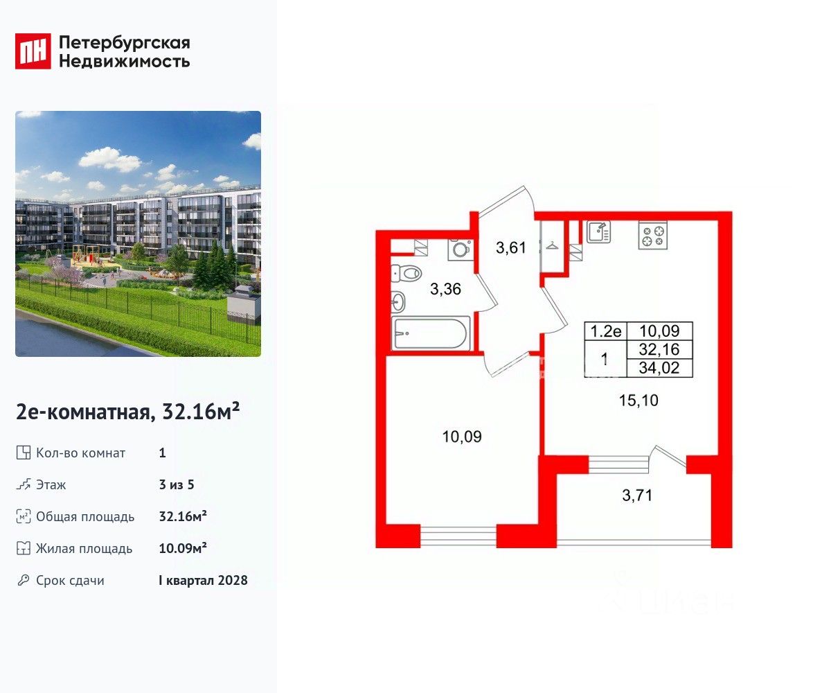 Удобная, классическая, функциональная европланировка, большая кухня-гостиная 15.1 м², вместительная прихожая 3.61 м². Общая площадь квартиры - 32.16 м², жилая 10.09 м², высота потолка 2.77 м.