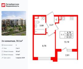 Удобная, классическая, функциональная европланировка, большая кухня-гостиная 13.19 м², вместительная прихожая 3.27 м². Общая площадь квартиры - 30.1 м², жилая 9.76 м², высота потолка 2.77 м.