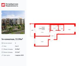 Удобная, классическая, функциональная европланировка, большая кухня-гостиная 17.1 м², вместительная прихожая 6.7 м². Общая площадь квартиры - 55.99 м², жилая 25.12 м², высота потолка 3.07 м.