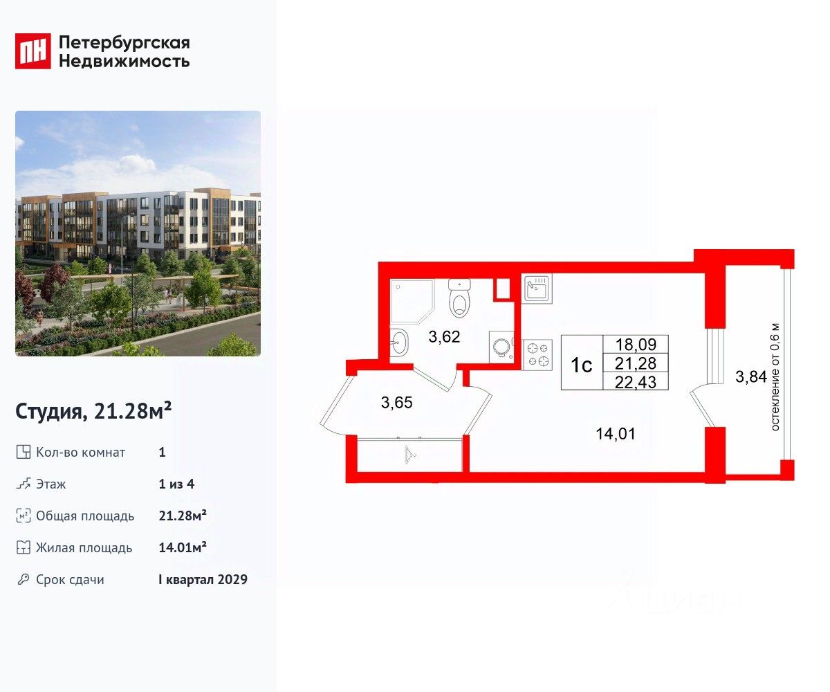 Удобная, классическая, функциональная европланировка, просторная прихожая 3.65 м². Общая площадь студии - 21.28 м², жилая 14.01 м², высота потолка 2.77 м.