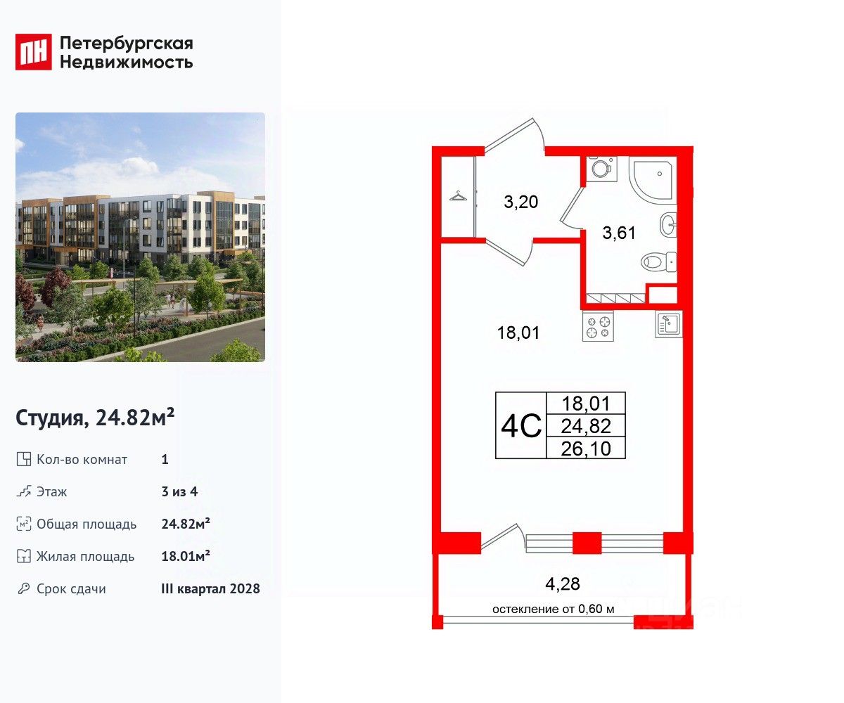 Удобная, классическая, функциональная европланировка, просторная прихожая 3.2 м². Общая площадь студии - 24.82 м², жилая 18.01 м², высота потолка 2.77 м.
