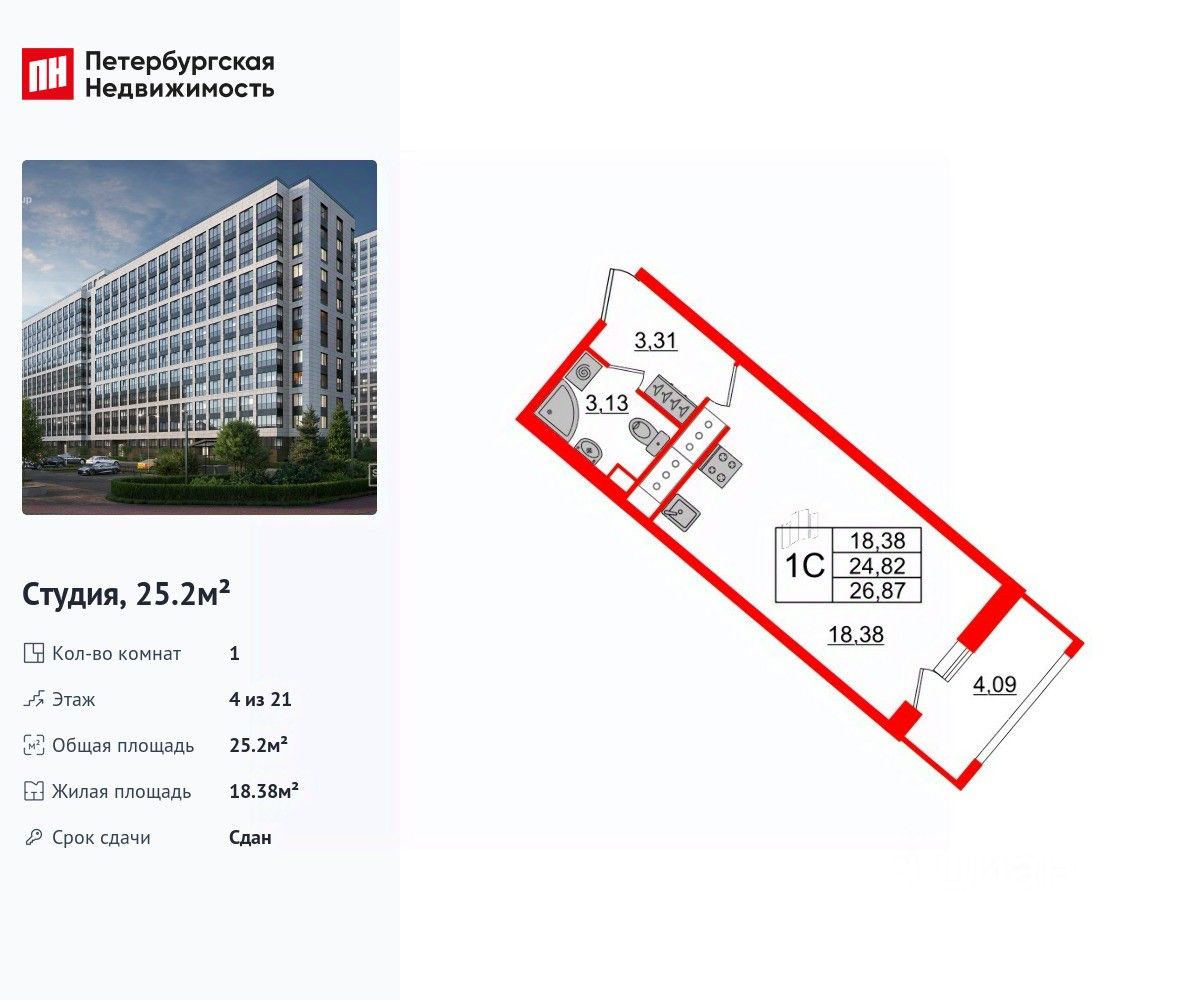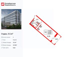 Удобная, классическая, функциональная европланировка, просторная прихожая 3.31 м². Общая площадь студии - 25.2 м², жилая 18.38 м², высота потолка 2.77 м.