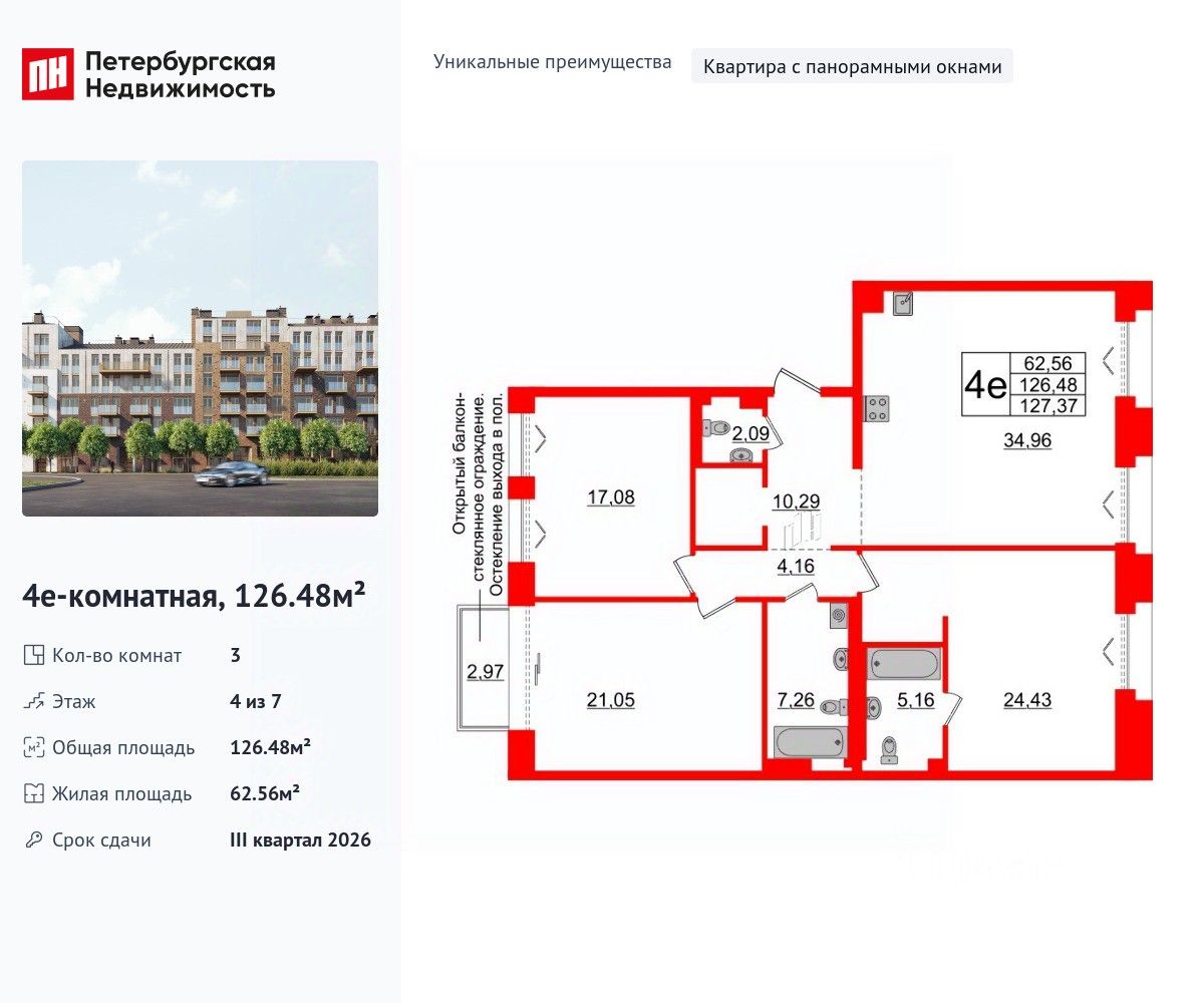 Уникальная, функциональная европланировка, большая кухня-гостиная 34.96 м², вместительная прихожая 10.29 м². Общая площадь квартиры - 126.48 м², жилая 62.56 м², высота потолка 3 м.