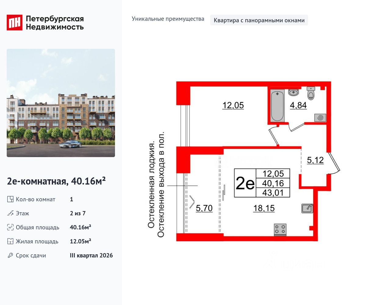 Уникальная, функциональная европланировка, большая кухня-гостиная 18.15 м², просторная прихожая 5.12 м². Общая площадь квартиры - 40.16 м², жилая 12.05 м², высота потолка 3 м.
