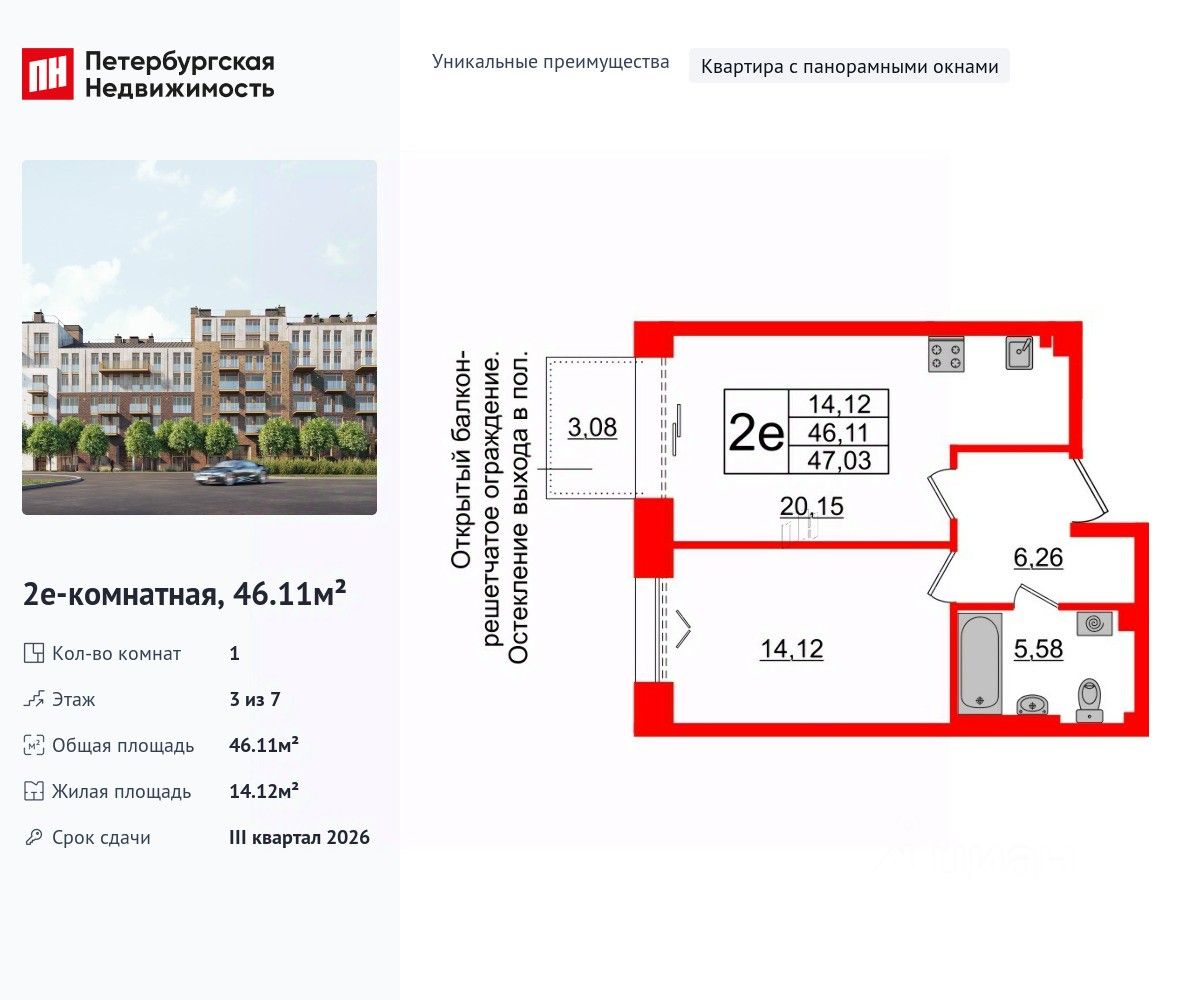 Уникальная, функциональная европланировка, большая кухня-гостиная 20.15 м², просторная прихожая 6.26 м². Общая площадь квартиры - 46.11 м², жилая 14.12 м², высота потолка 3 м.