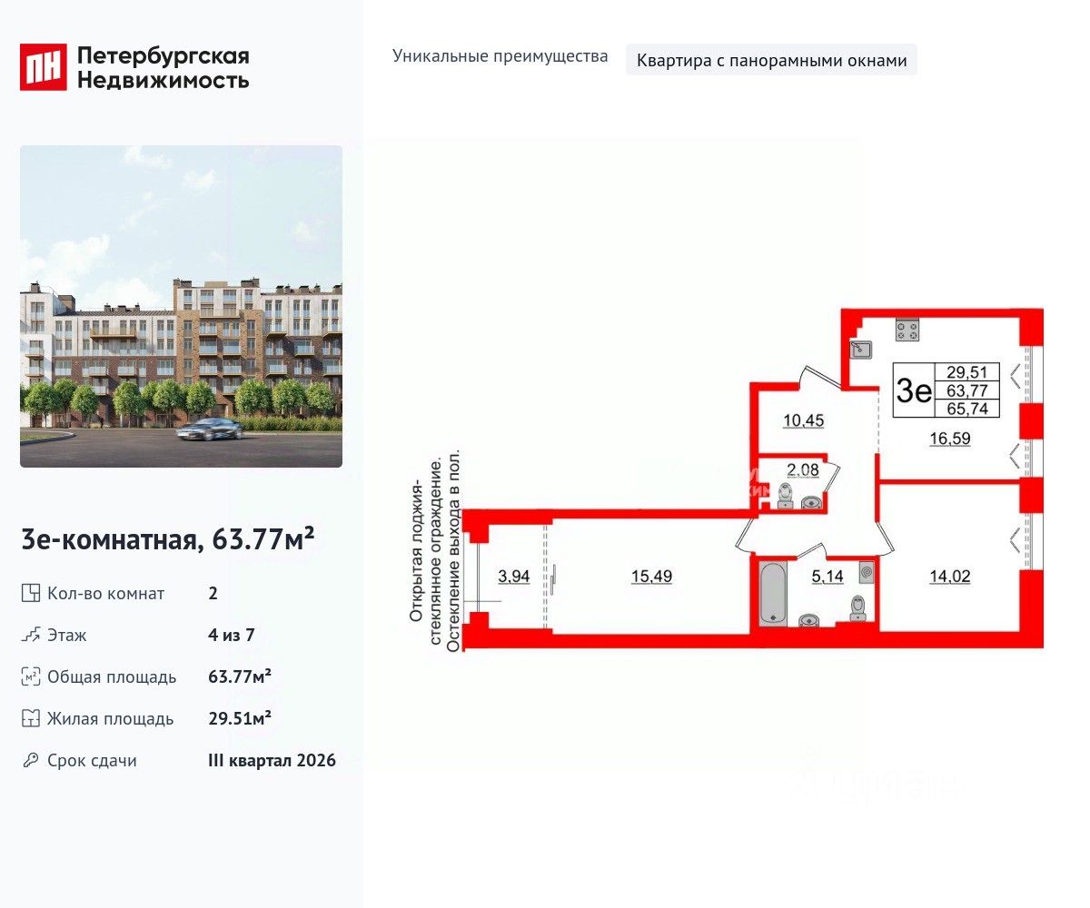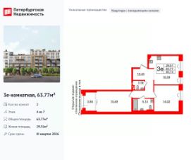 Уникальная, функциональная европланировка, большая кухня-гостиная 16.59 м², просторная прихожая 10.45 м². Общая площадь квартиры - 63.77 м², жилая 29.51 м², высота потолка 3 м.