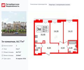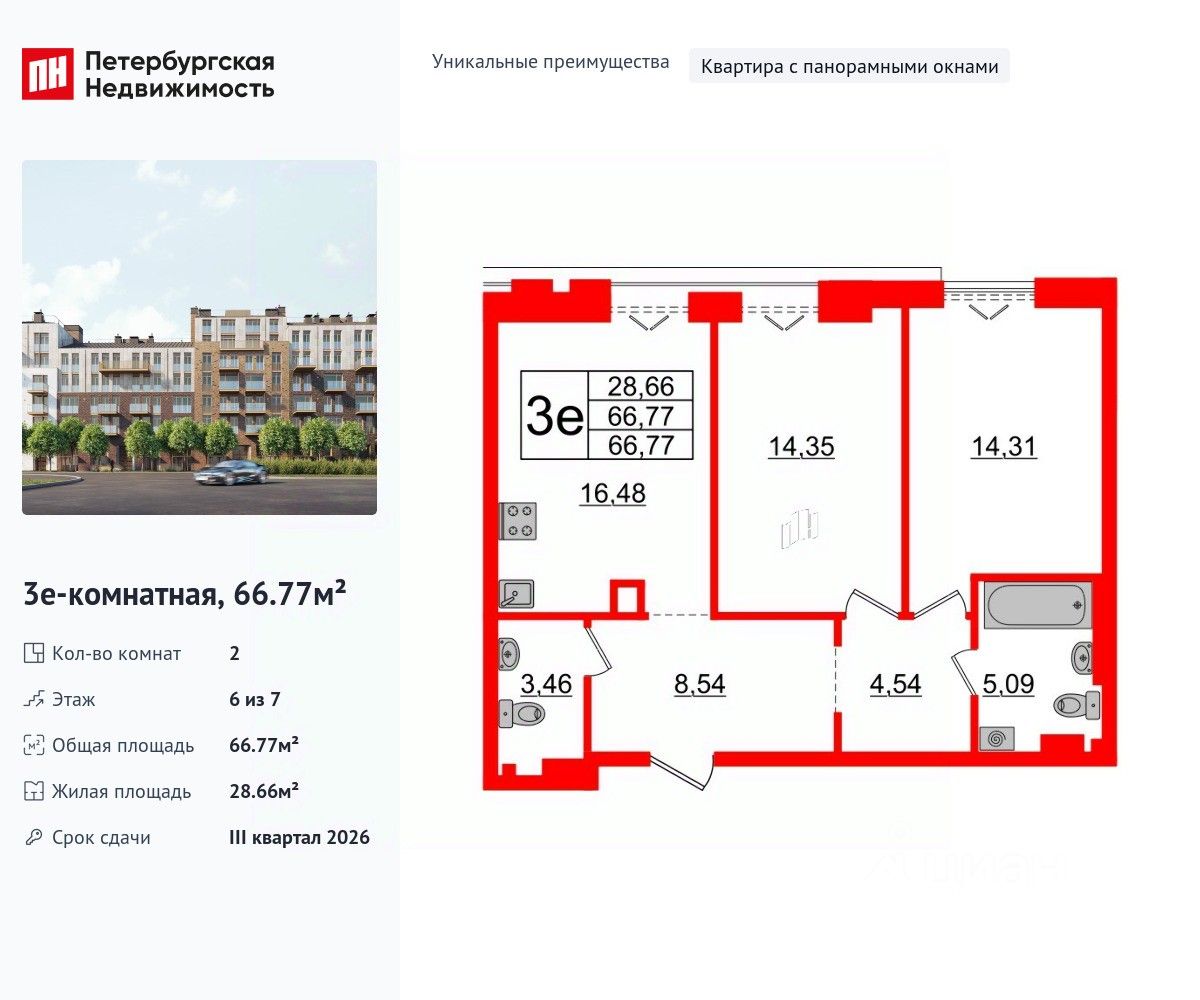 Уникальная, функциональная европланировка, большая кухня-гостиная 16.48 м², просторная прихожая 8.54 м². Общая площадь квартиры - 66.77 м², жилая 28.66 м², высота потолка 3 м.