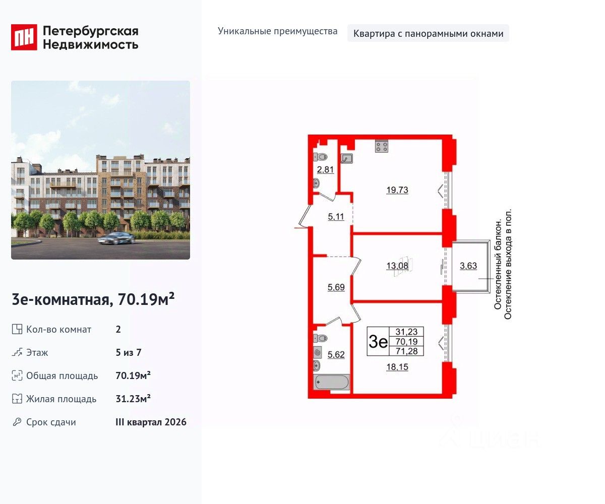 Уникальная, функциональная европланировка, большая кухня-гостиная 19.73 м², вместительная прихожая 5.11 м². Общая площадь квартиры - 70.19 м², жилая 31.23 м², высота потолка 3 м.