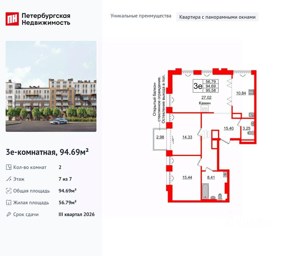 Уникальная, функциональная европланировка, большая кухня-гостиная 10.84 м², просторная прихожая 15.4 м². Общая площадь квартиры - 94.69 м², жилая 56.79 м².