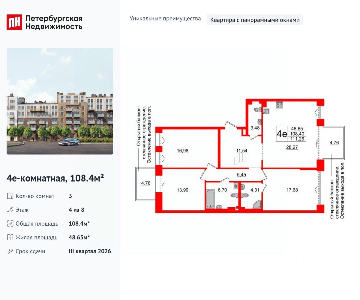 Уникальная, функциональная европланировка, большая кухня-гостиная 28.27 м², просторная прихожая 11.54 м². Общая площадь квартиры - 108.4 м², жилая 48.65 м², высота потолка 3 м.