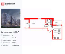 Удобная, классическая, функциональная европланировка, большая кухня-гостиная 15.3 м², просторная прихожая 4.44 м². Общая площадь квартиры - 40.89 м², жилая 17.28 м², высота потолка 2.77 м.